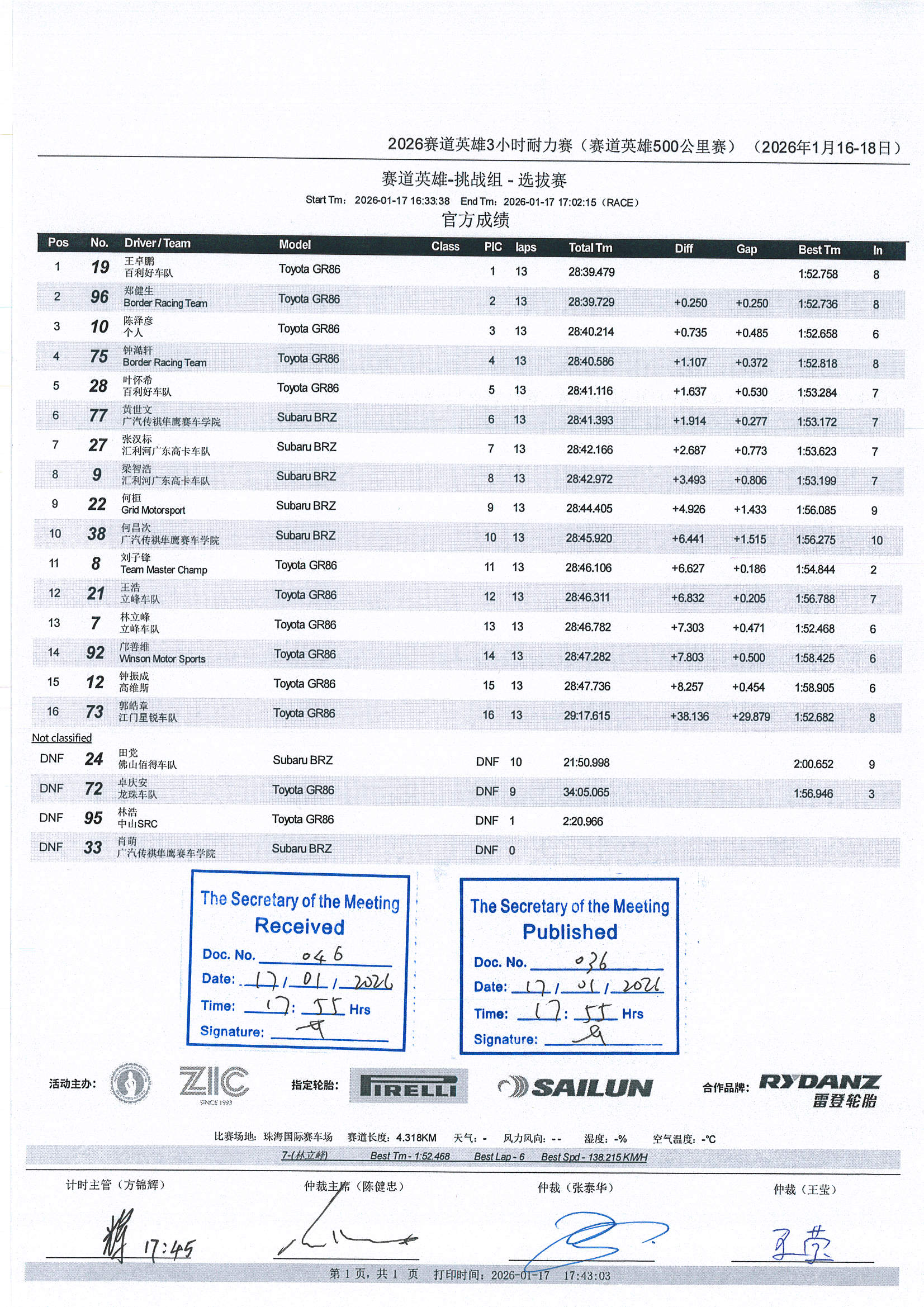 On January 17th, 2026 Circuit Hero - Challenge Group Selection Race kicked off at Zhuhai International Circuit. Wang Zhuopeng, No.19 driver from Baohui Racing Team, achieved a perfect performance and won the race, thus starting the first battle of 2026. Zheng Jiansheng, No. 96 driver from Border Racing Team, took the second place. No. 10 driver Chen Zeyan participating in the race as an individual, won the third place.